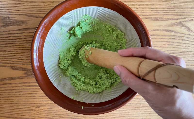 | ① | 枝豆を茹でて、薄皮を剥がす。すり鉢に枝豆を入れ、アボガドオイル大さじ2を加え、すりこぎですり潰す。ペースト状にした枝豆を大さじ1だけ飾り用にとっておく |