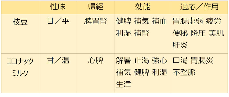 薬膳的には夏場に失われがちな体液を補い、暑気払いをしてくれるので、暑くて湿度の高いエスニック料理には欠かせない存在となっています。海辺に育つココヤシですが、海水を吸い上げて成長するため、ココナッツミルクにはカリウム・鉄・マグネシウムなどのミネラル分を豊富に含んでおり、ミネラル分を汗と共に失われてしまう夏場には重宝する食材です。